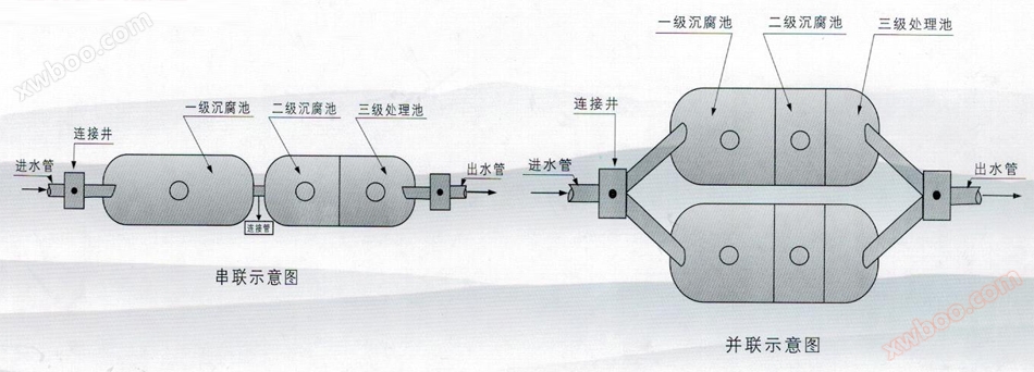 6、化粪池容积如超过1 00m3时,可用两个单罐并联或串联设置,若串联,设计人员与用户必须提前通知厂家预置,罐体外壁间距不得小于500mm。