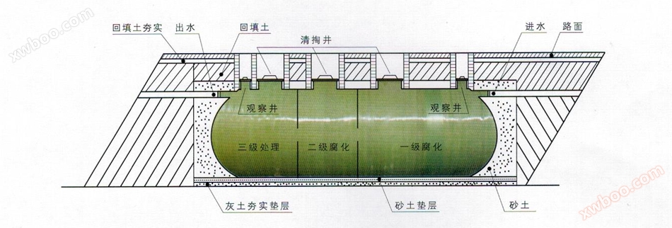3、整体生物化粪池最小覆土0.3m,覆土不宜超过3m。在寒冷地区,温度低于一1 00C时,化粪池的覆土深度不得小于1.2m,在最冷月平均气温低于一130C的地区,设计人员在考虑化粪池的设置深度时,化粪池的水面应设置在该地区的冰冻线以下为宜。