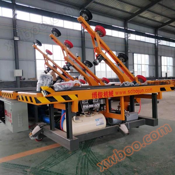 玻璃下片机功能与特点:具有操作移动灵活,设备可遥控360度旋转、行走可自由移动,上片可自动找正玻璃的任意左右上下角度,行走轮自动着地装置成功的解决了地面不平设备跑偏的问题;玻璃下片机内置大功率空压机,真空泵,不需要再附加气路;吸真空系统冂真空开关自动控制,当玻璃未吸牢时自动检测停止工作并报警未吸住玻璃,具有PLC电脑控制,使控制系统比较的稳定不出错,整机配备手动与自动两套程序,并具有一键上片(注:当真空检测吸牢后,浮动臂自动向上升高玻璃80mm使玻璃之间分离40mm,避开了把整包玻璃带起来的危险),中途任意角度急停机后解除急停后可继续原来的动作。使玻璃下片机比较的人性化、自动化动作,解决了很多的人工成本和危险因素。